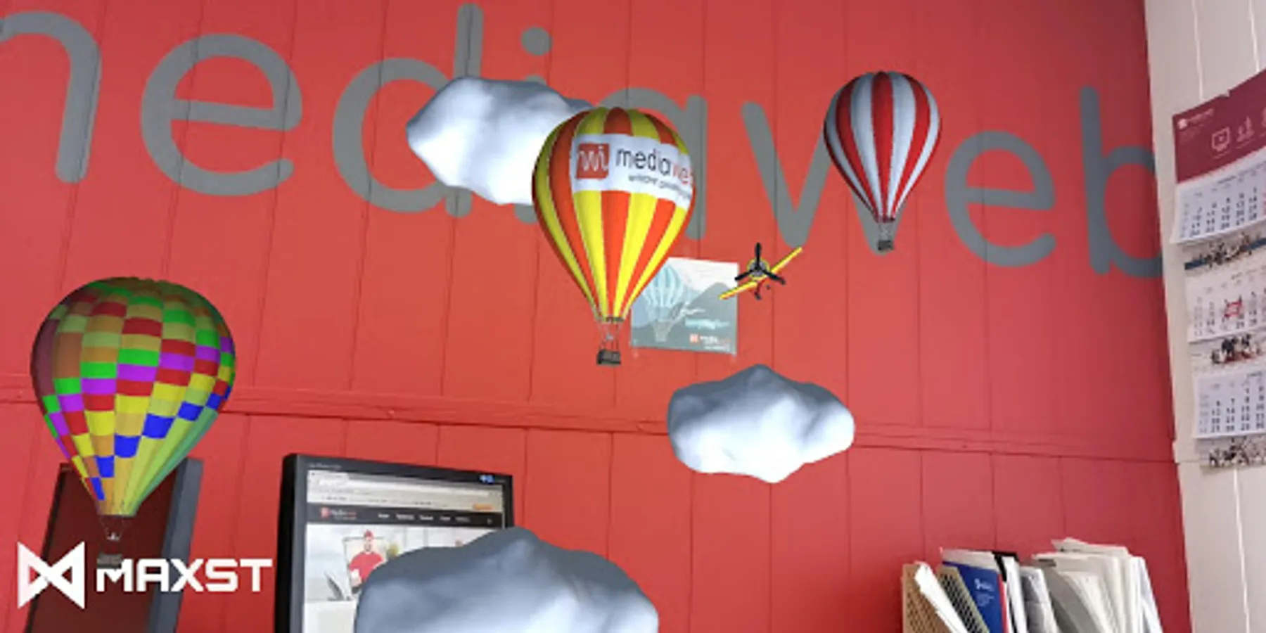 Point the camera at the printed image of the object so that it fully fits into the screen of the device. Almost immediately after this, on top of the image you will see balloons flying around the room, clouds and a toy airplane.