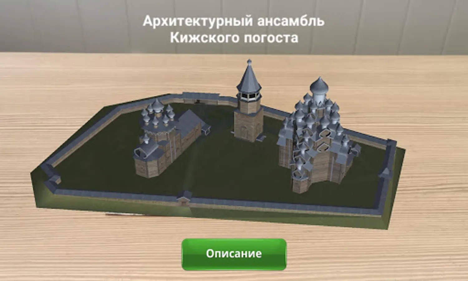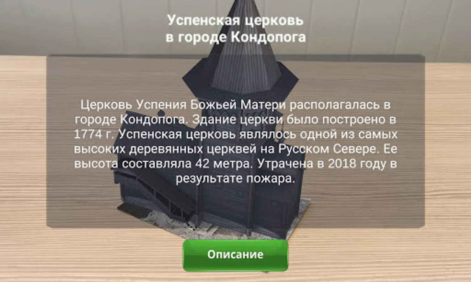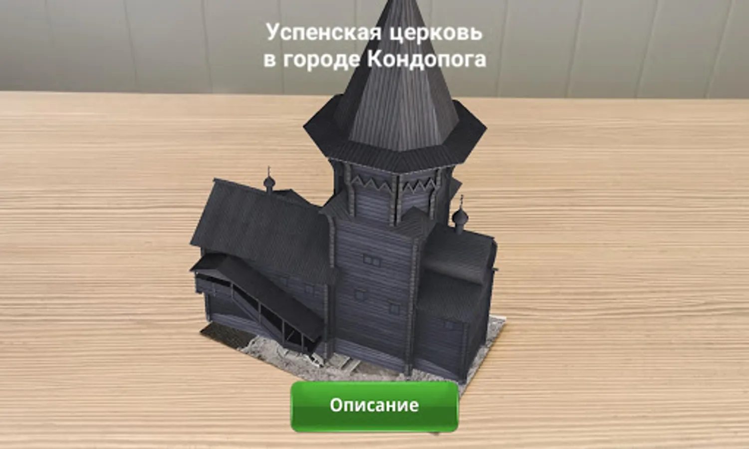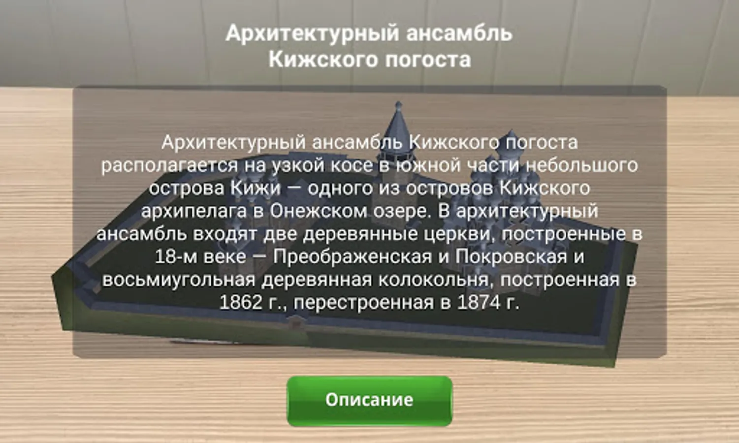 The main objective of this application is to get acquainted with examples of wooden architecture of the Republic of Karelia: the architectural ensemble of the Kizhi churchyard, the Chapel of the Archangel Michael, the House of the Peasant Oshevnev, Windmill with about. Volkostrov and the Assumption Church in the city of Kondopoga.