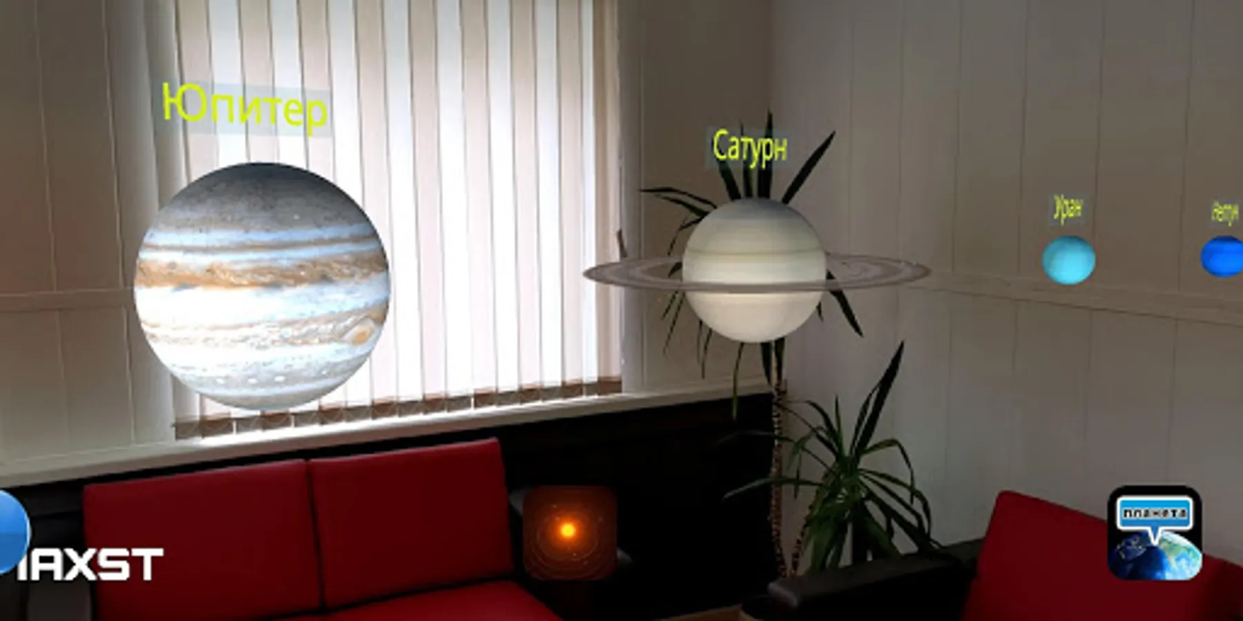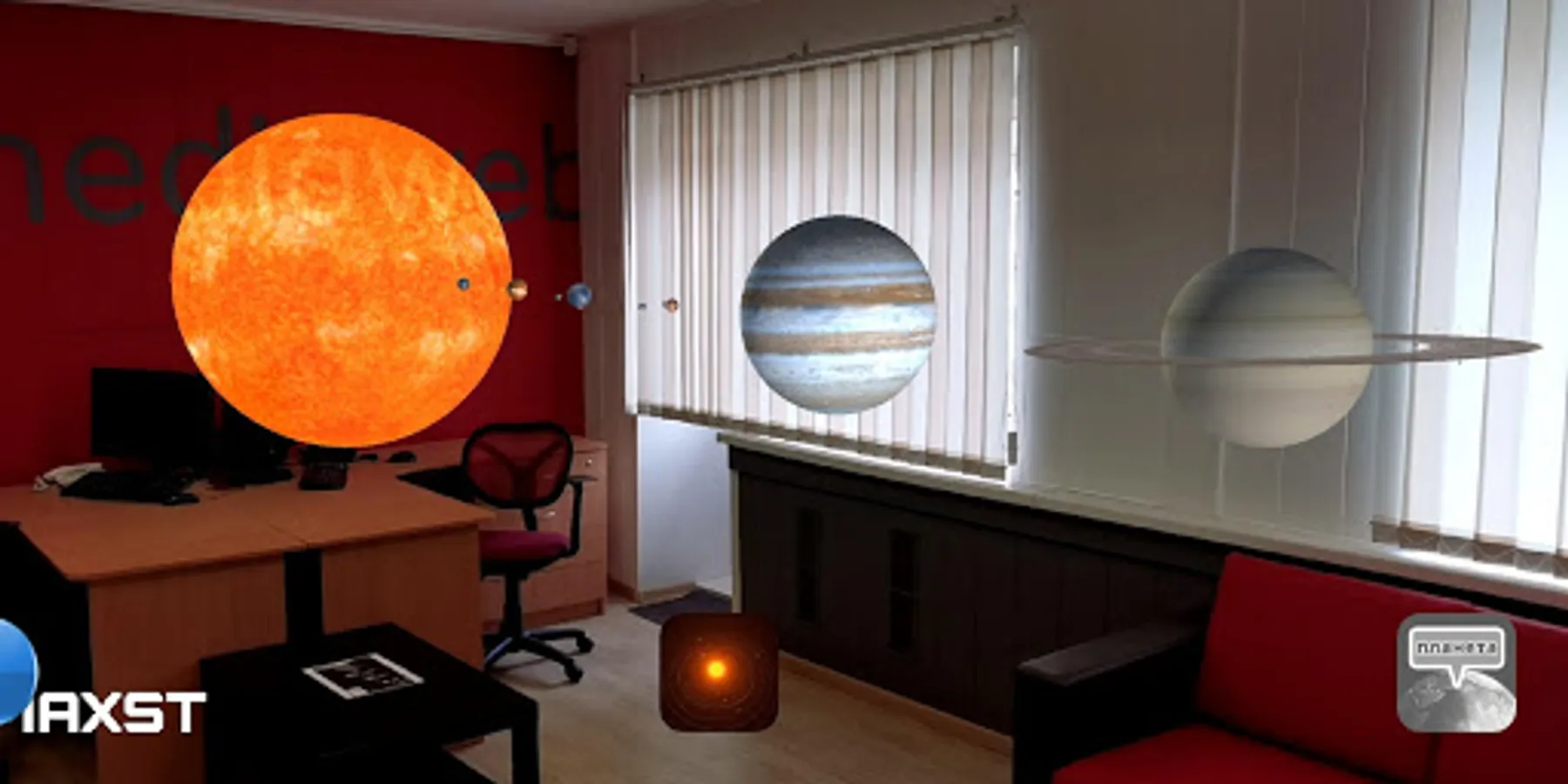 Point the camera at the printed image of the solar system so that it fits perfectly into the device’s screen. Almost immediately after that, at an altitude of approximately 1.5 meters from the placed image, you will see a virtual 3D model of the solar system with planets.