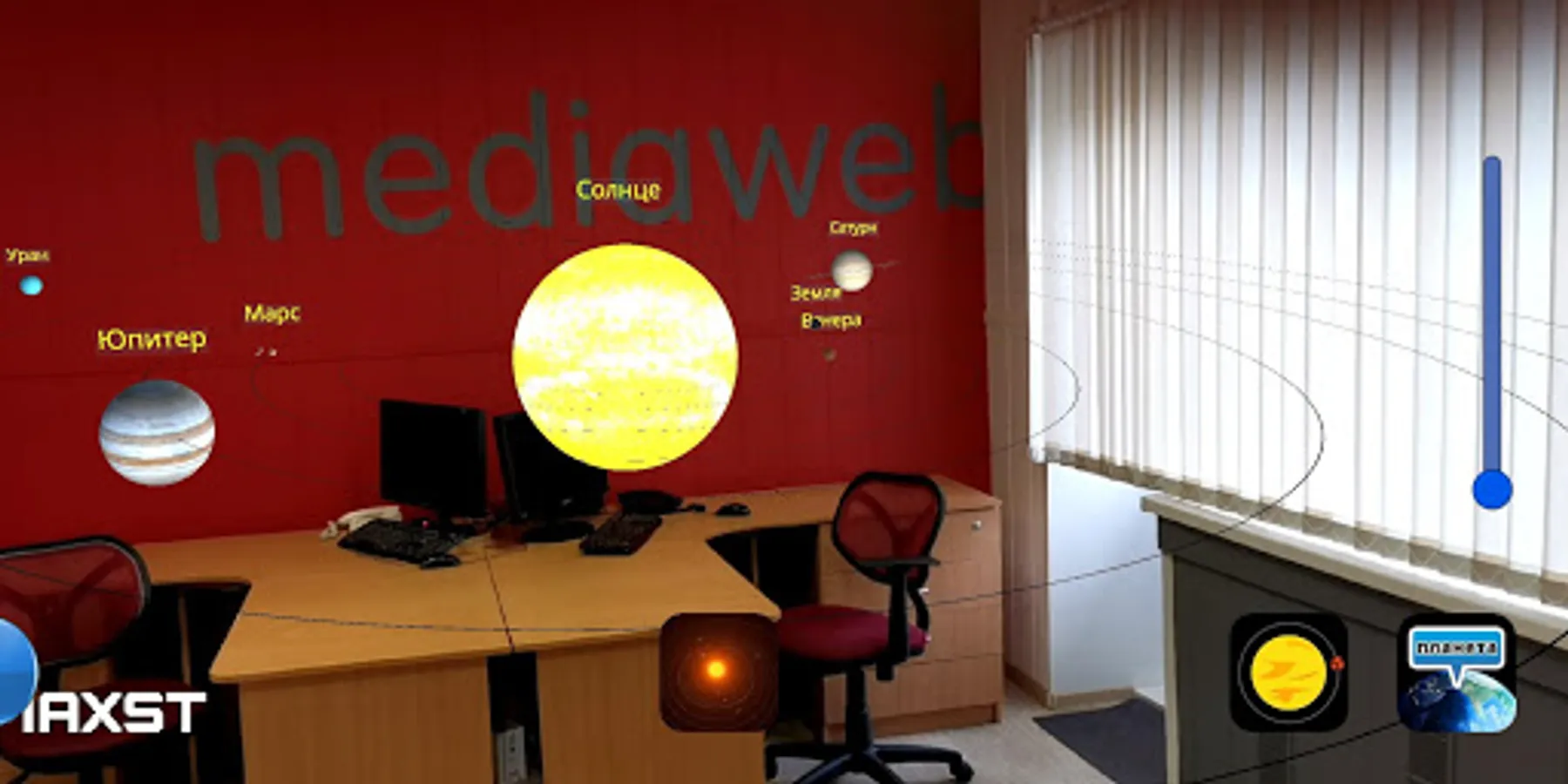 For the application to work, you need an image of the Solar System, which you can download at https://mediaweb.ru/marker_solarsystem.png and print.