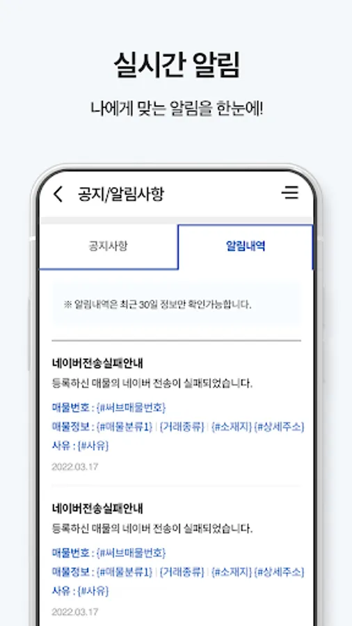 We notify you in real time of false sale reports and same-week retail items, and provide notifications if the sale sent to Naver Real Estate fails.