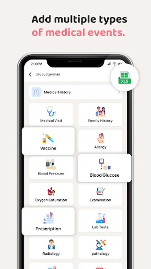 Types of medical record: Medical Visits, Family History, Vaccine logs, Allergy logs, Blood Pressure logs, Blood Glucose logs, Oxygen Saturation logs, Examination logs, Prescription logs, Labtest logs, Radiology logs, Pathology logs, Surgery logs, Notes and appointment.