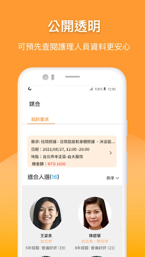 [Quick Matching] Set the required time and conditions from the mobile APP, and the system will screen out the caregivers that meet your needs to speed up the matching speed.
