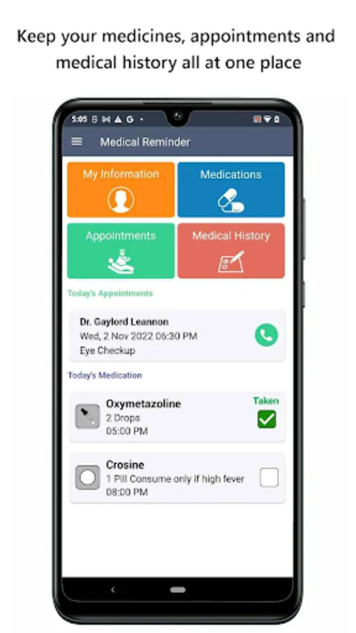 Medical Reminder has been comprehensively formulated to keep you on track with your Medications and Doctor appointments. With an amazing Elderly Friendly UI, Medical Reminder has been designed with every patient's needs.