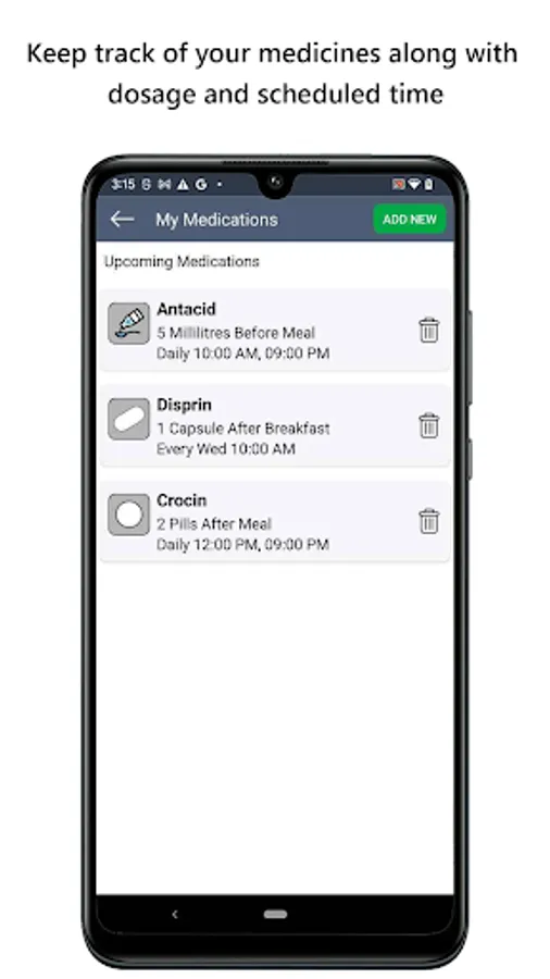 Simply input your medication name and dosage, select the type of medicine, note down any instructions, and set schedules of when to take them. The App will alert you at the time you need to take your medication.
