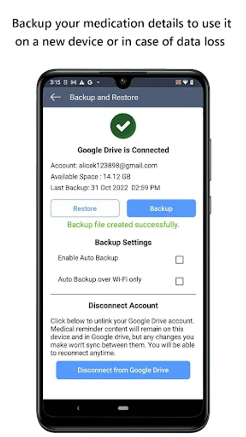 • Afraid of losing your medical records? Simply create a backup file of your Medical Reminder data. When you get a new Android phone, you can now back up and restore your medical data.