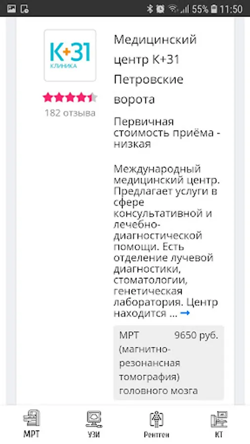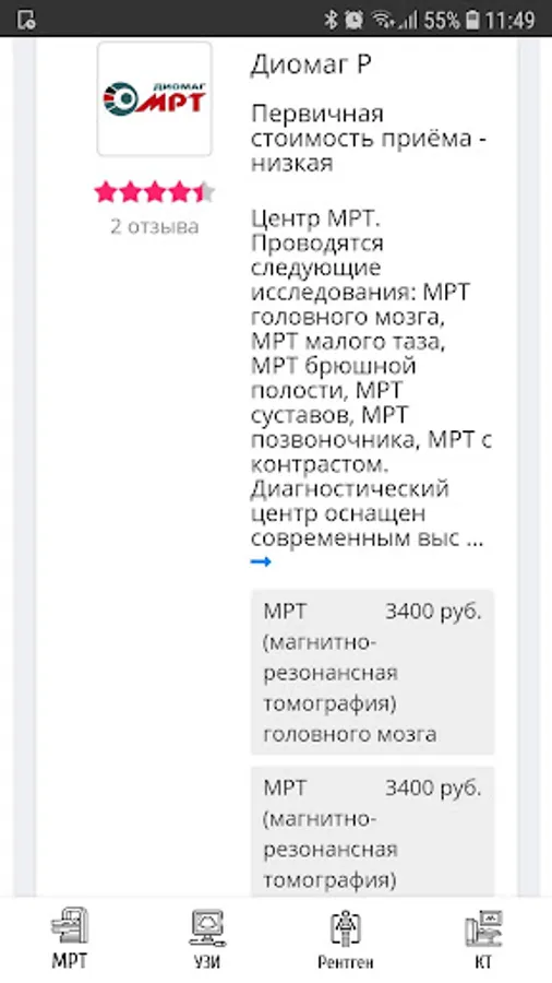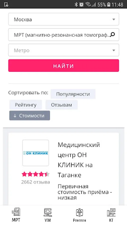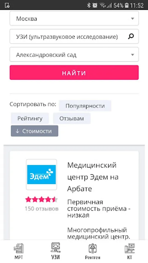Using the application, you can find a suitable center for MRI, ultrasound, X-ray, CT diagnostics and choose the optimal medical center for price, rating and location.