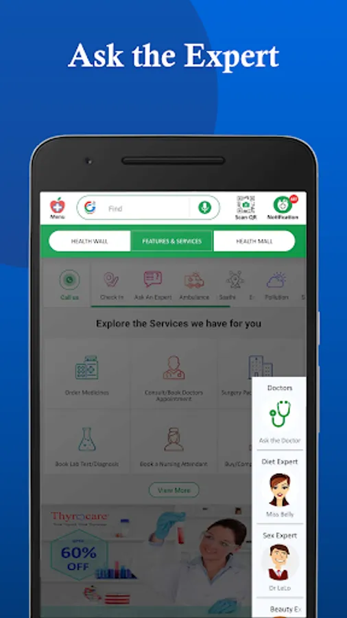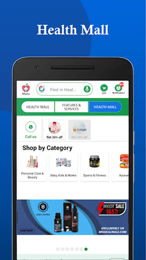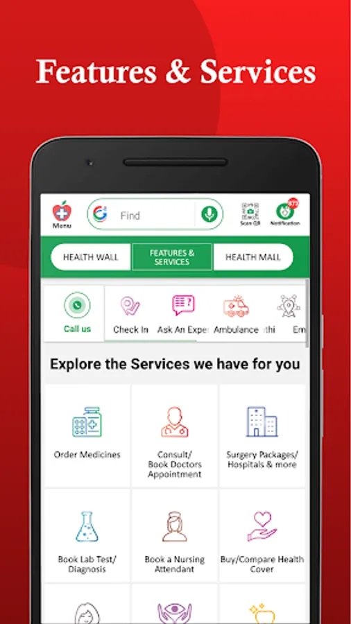There are 3 categories of our app - HEALTHWALL, FEATURES & SERVICES & HEALTHMALL.
