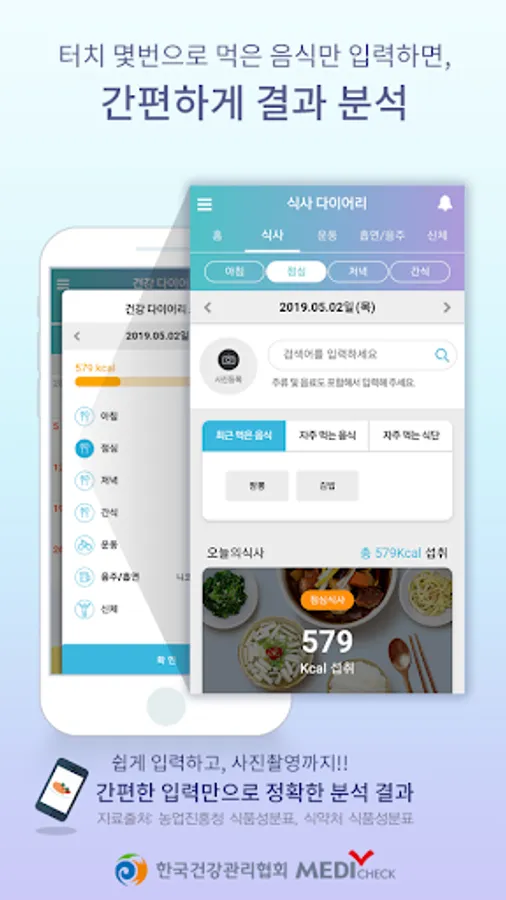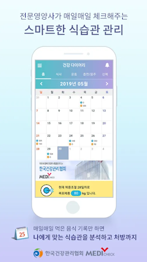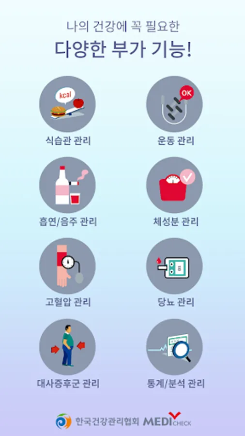 메디체크케어는 한국건강관리협회 전문가가 회원 식습관을 모니터링&관리를 통해 건강을 케어해주는 서비스 기능을 제공합니다.