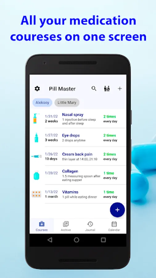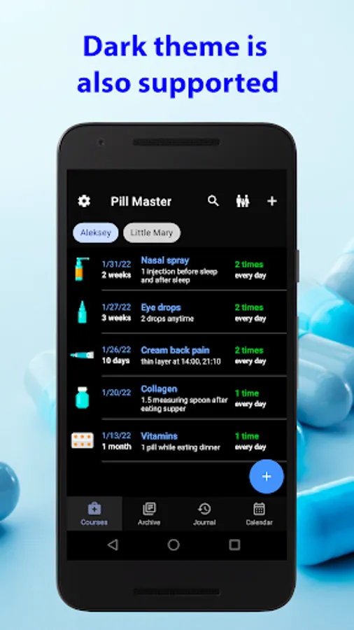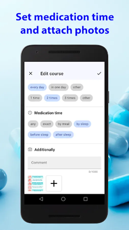 • Easy to add medication courses for all you drugs. You may select duration, dosage, medication time by several clicks. Several types are supported for the medication time. When you select 'any' medication time then it will be distributed evenly from waking up to bedtime. Or you may specify exact time to take a medicine. Also it is very easy to select before eating, during eating or after eating medication times. And of course you may set up this app to remind about your tablets before sleep and after sleep. All these times for the breakfast, dinner, supper, sleep may be easily changed at the Preferences. You may also attach your medicine photos directly to the course.