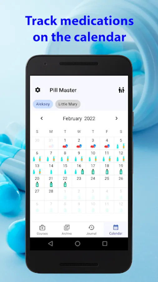 • Advanced calendar view for all your medication courses. This app is also featured with calendar view where you may easily access medications. If you click on the date before the current day then taken medications are displayed. If you click on the current or future dates then screen with active courses for that date is opened. You may edit courses and medication events directly from calendar.
