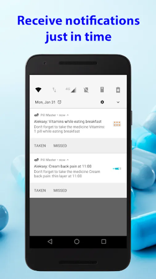 • Detailed log about missed or taken drugs. After you receive reminder about a medicine you may select 'Taken' or 'Missed'. This information is saved in the log and may be reviewed later. Also you may mark a medication as taken or missed later directly from the app.