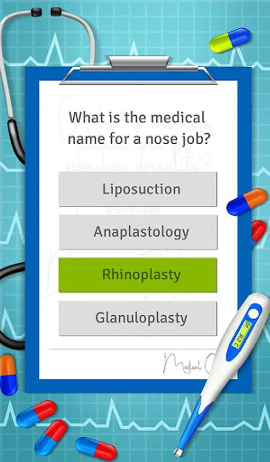 Are you hooked on medical drama series like ER, General Hospital and you cannot wait for new episodes of Grey's Anatomy? If you are really into medical TV shows, then you will be also into this free medical trivia game! Get this 💊 General Medical Quiz On Human Anatomy 💊 and give answers to these health and medical questions! See if you know all medical terms and can you guess the names of all external and internal organs. Test your knowledge on bones and muscles anatomy as well as cells and tissues. What is a medical name for a nose job? What medications are used to manage localized allergic reactions? Train your brain and answer these medical surgical nursing questions. Solve this medical terminology quiz app free about human anatomy and physiology. Have fun and acquire new information about medication side effects, diagnosis and treatment of diseases, and some fun medical trivia facts about MRI and CT scans. It's an interesting science game for adults and educational game for girls, boys and everyone who is fascinated by the study of health and medicine. So don't waste more time and start solving these human physiology questions!