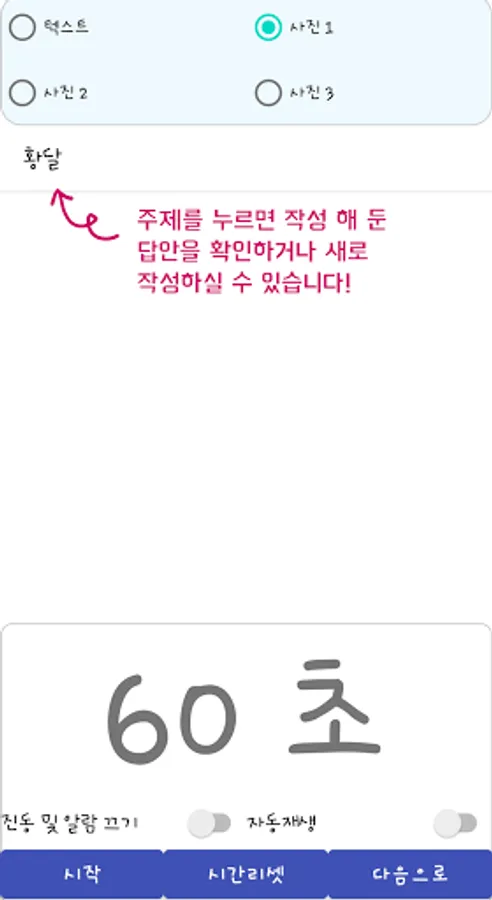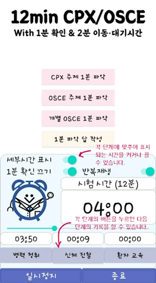 A timer will work for 1 minute, and you can practice in front of the door for 1 minute to think about what questions to ask and what to have a physical examination in your head. Check 'Auto-play' to automatically skip, and press the 'Vibrate Off' button to turn off the vibration that rings when 1 minute is up!
