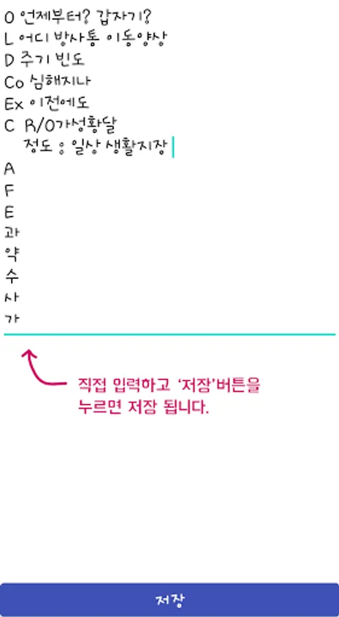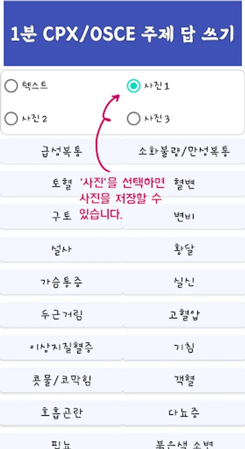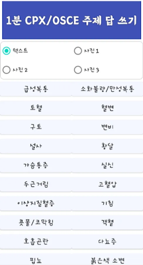 When each topic, for example, 'Acute Abdominal Pain' appears on the screen, press it! You can check your own answers written in 'Writing One-Minute Answers', and you can write and edit them right away. Depending on the type you want, you can select Text/Photo1/Photo2/Photo3 from the screen above.