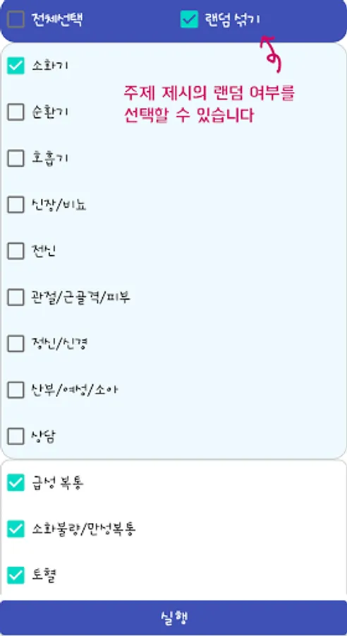 This is a function that randomly selects a lot of topics and puts them on the list. First, you will be taken to the screen where you can select a topic. It is convenient to use the Select All and Select by Subject buttons. If you click the 'Execute' button, only the selected topics will be displayed one by one in the list. At this time, it may or may not be displayed randomly depending on whether the 'Random Shuffle' checkbox is selected.