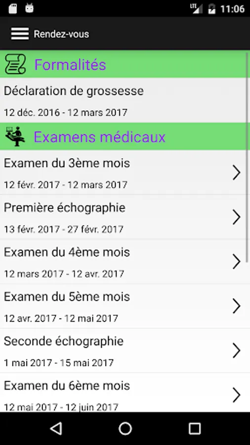 - A pregnancy calendar: formalities to be fulfilled (declaration pregnancy ...). The appointments take for consultations, examinations, mandatory ultrasounds. The management of these appointments: an affair with the smartphone calendar and a warning not to forget the appointment.