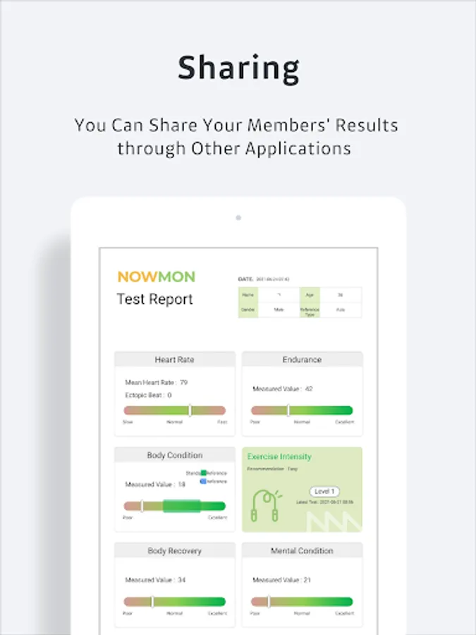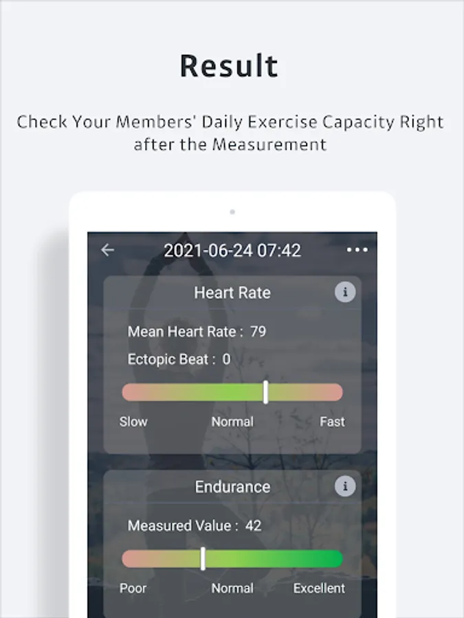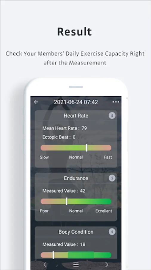 1 minute measurement provides heart rate, endurance, body condition, recommended training intensity, body recovery, and mental condition.