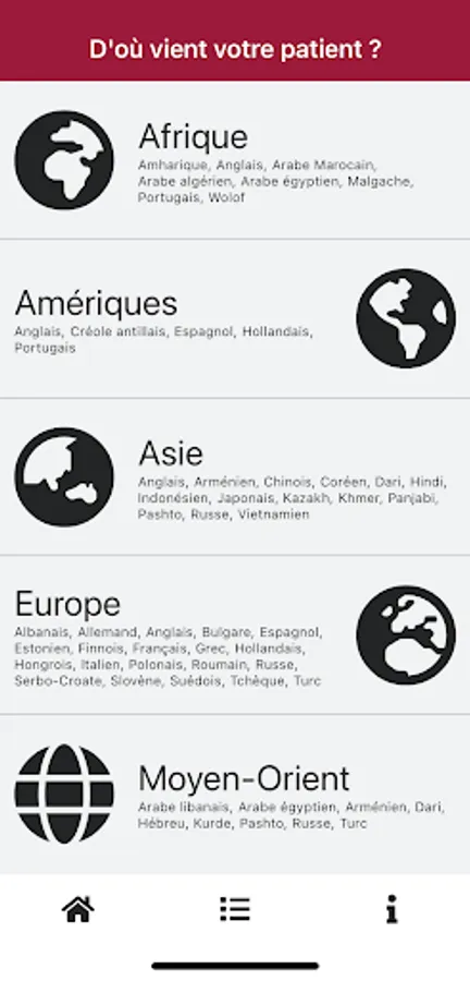For each language, you will find the vocabulary and the essential questions for the clinical examination, device by device.