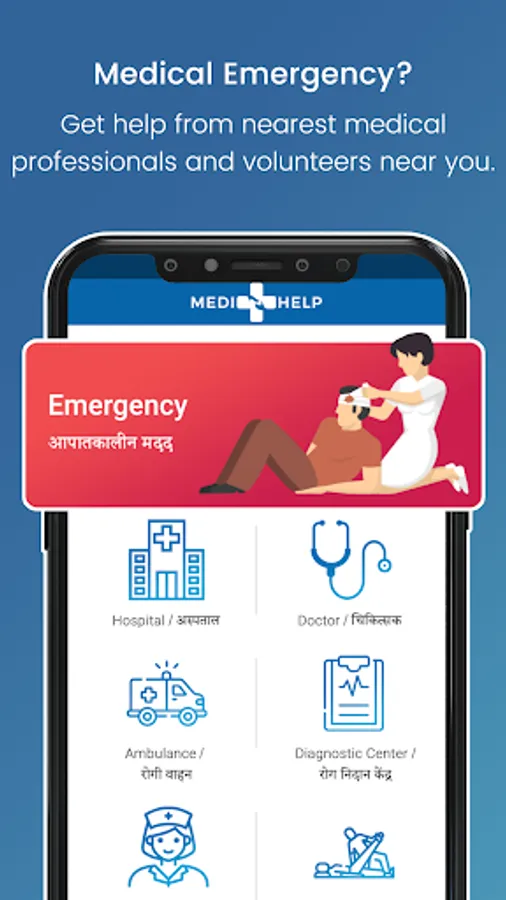 - In Case of Medical Emergency, seek GPS based help from Medihelp's Network of Social Volunteers, Medical Volunteers (Medi Angels), Nearest Hospitals, Ambulance service, Near & Dear Ones, and Government Helpline.