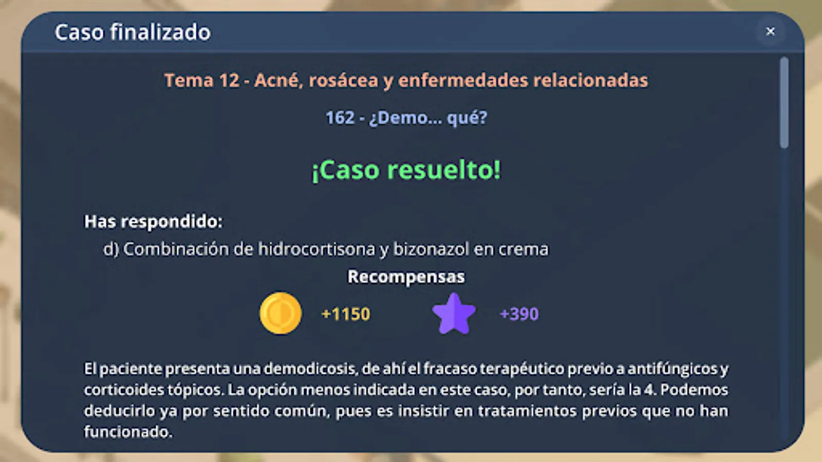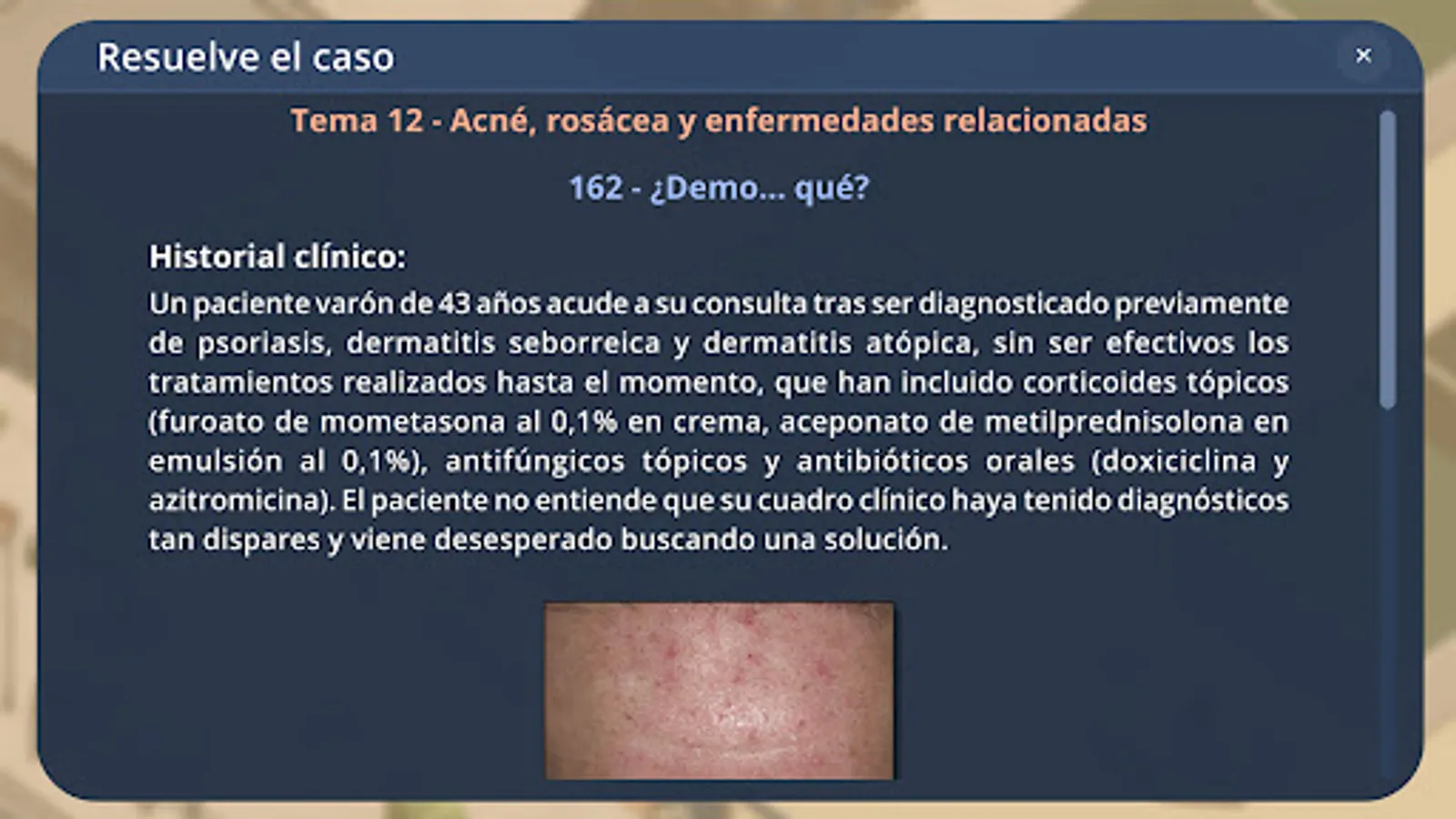After the pandemic, medical training and more specifically in dermatology requires more innovative approaches, so we present a totally different approach based on gamification. Build your own clinic while updating your knowledge in different areas of dermatology through more than 300 original clinical cases. After completing the course and taking the relevant exam, 8.4 continuing education credits will be obtained as it is a teaching activity accredited by the Commission for Continuing Education for Health Professions of the Community of Madrid-National Health System.