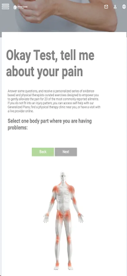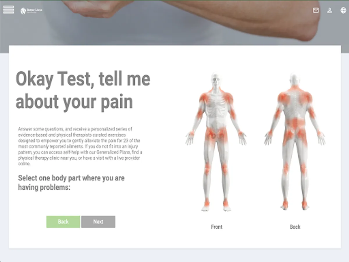 Better Lives is a HIPAA-compliant pattern-recognition tool that identifies common pain patterns than can be treated with Physical Therapy strategies. The tool then creates a personalized series of therapeutic exercises designed to empower you to gently alleviate the pain.