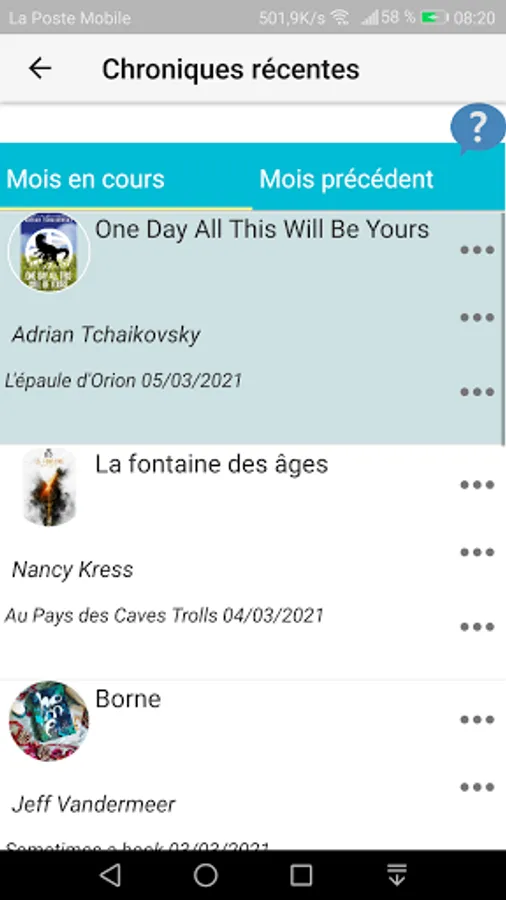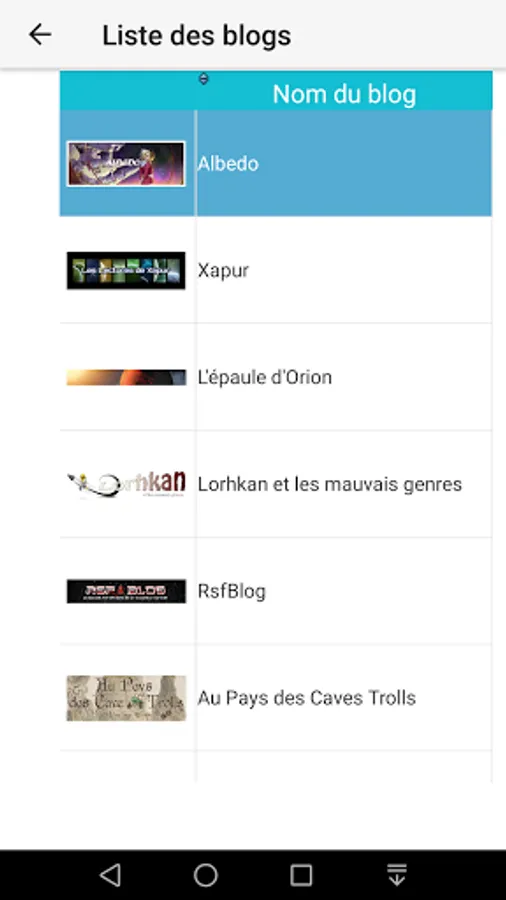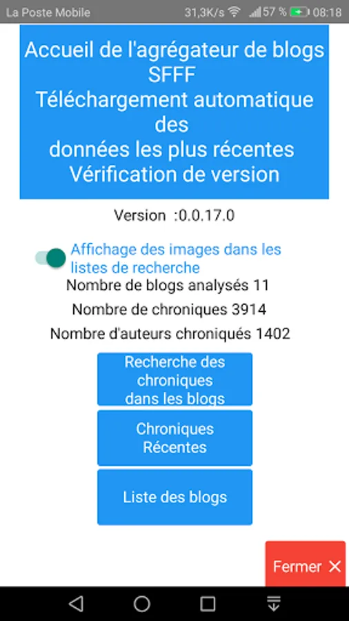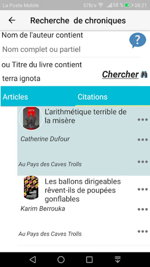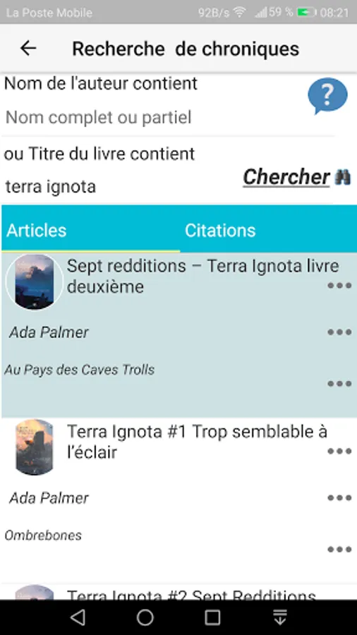 This application allows you to quickly search, by title or author, chronicles from various French-language Science-fiction, Fantasy and fantasy blogs.