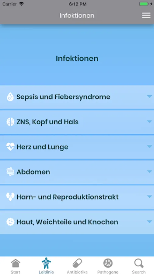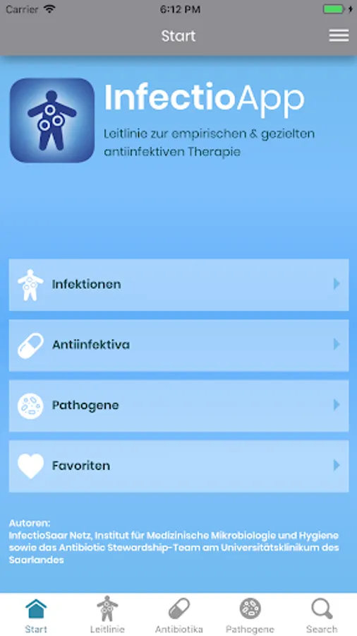 The Infectio app contains a compact guideline for the use of antibiotics and other anti-infectives for the treatment of human infections. The Infectio app is aimed at doctors and other medical professionals. This guideline was created by the Saarland InfectioSaar network (funded by the Ministry of Social Affairs, Health, Women and Family in Saarland) in collaboration with the Antibiotic Stewardship team of the Saarland University Hospital. In addition to therapy recommendations, the Infectio app provides information on important pathogens and the clinical symptoms and diagnostics of certain infections. In addition, characteristics of commonly used drugs are shown. The aim of the guideline is to provide doctors with an overview and assistance in the diagnosis and therapy of various infections. However, the Infectio App cannot replace the individual therapy decision of the individual doctor based on patient-specific factors. The Infectio app is based on current guidelines from scientific societies and clinical trial results. References to further literature are stored in the guideline.