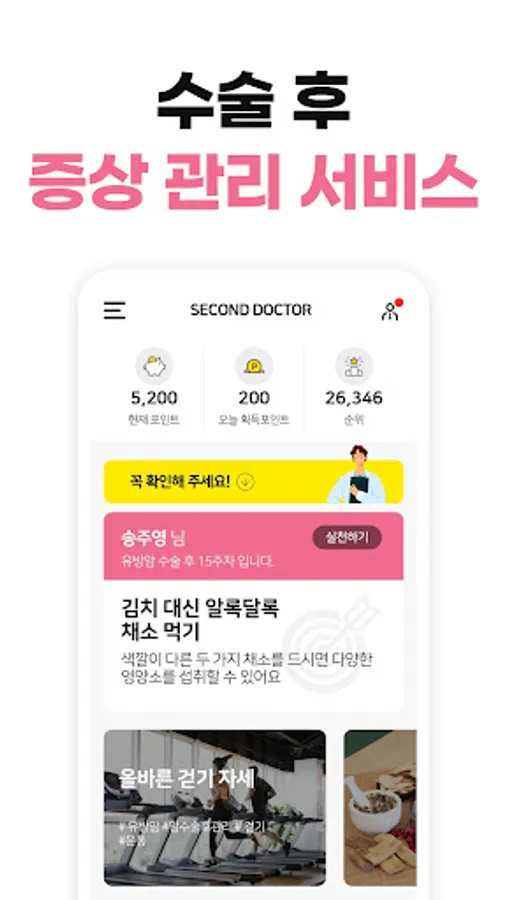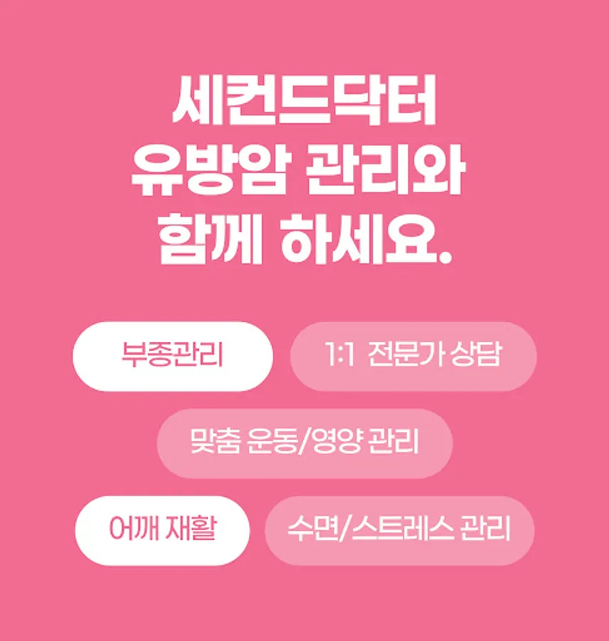 • Breast Cancer by Second Doctor does not provide a single-information guide. We provide customized services suitable for serious diseases by analyzing the user's condition in multiple directions, such as medical history, recovery progress, gender, age, and body information.