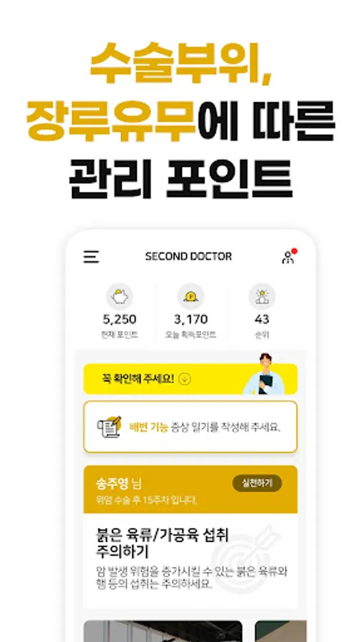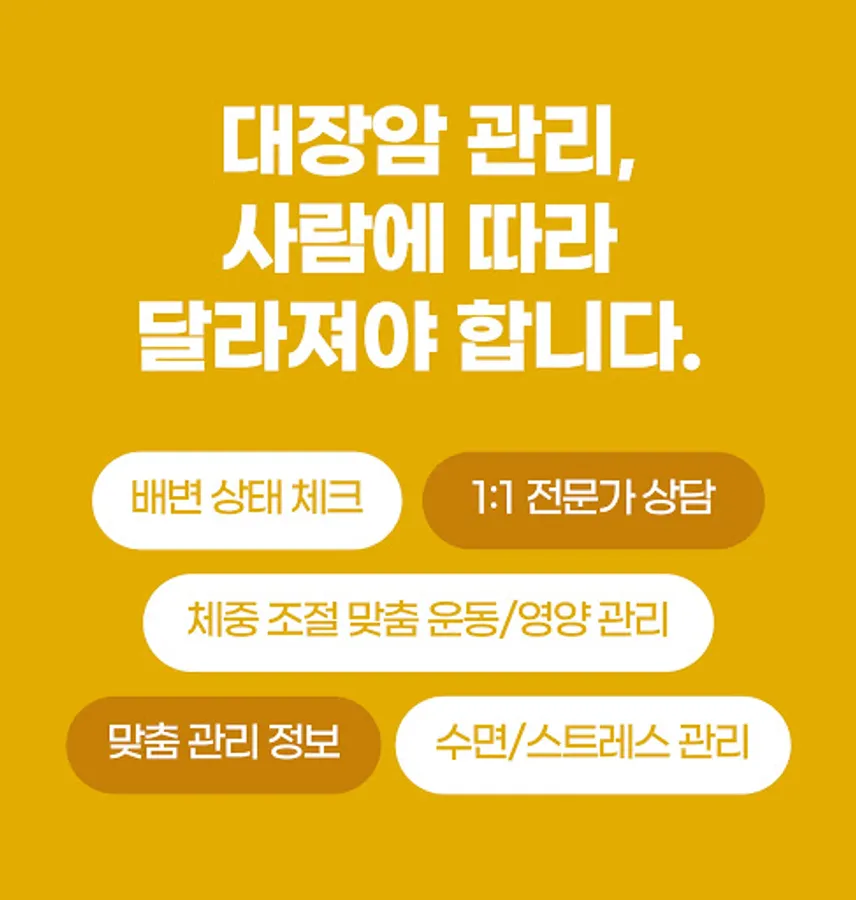 • Colorectal Cancer by Second Doctor does not provide a single-information guide. We provide customized services suitable for serious diseases by analyzing the user's condition in multiple directions, such as medical history, recovery progress, gender, age, and body information.