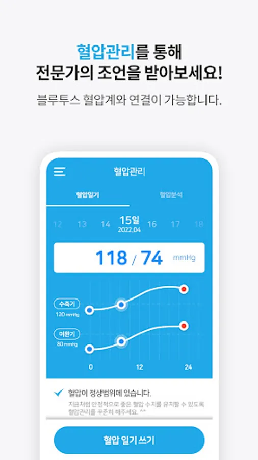 • Blood pressure management: You can create and manage a blood pressure diary either directly or through a Bluetooth blood pressure monitor.
