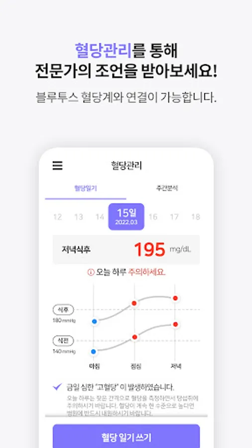 • Blood glucose management: You can create and manage a blood glucose diary either directly or through a Bluetooth blood glucose meter.