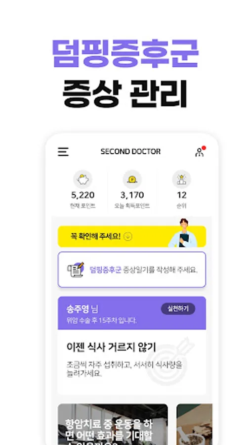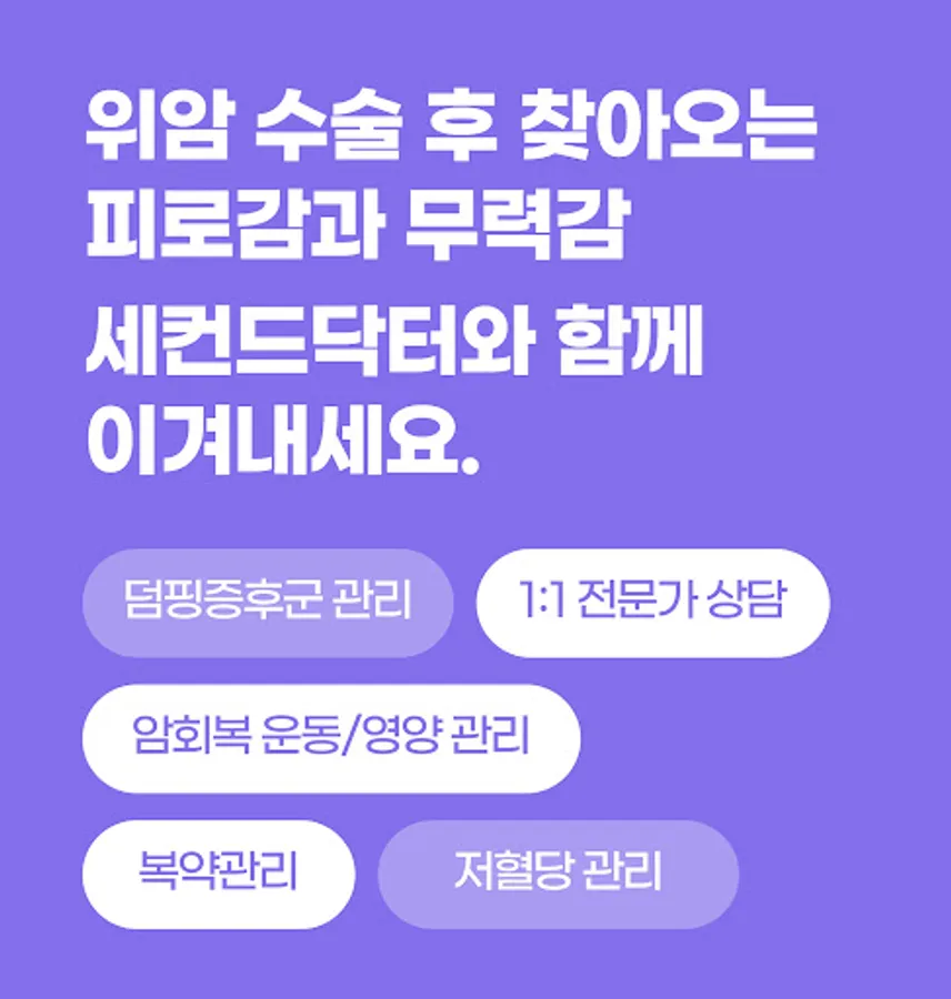 • Stomach Cancer by Second Doctor does not provide a single-information guide. We provide customized services suitable for serious diseases by analyzing the user's condition in multiple directions, such as medical history, recovery progress, gender, age, and body information.