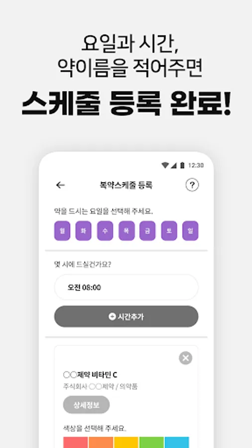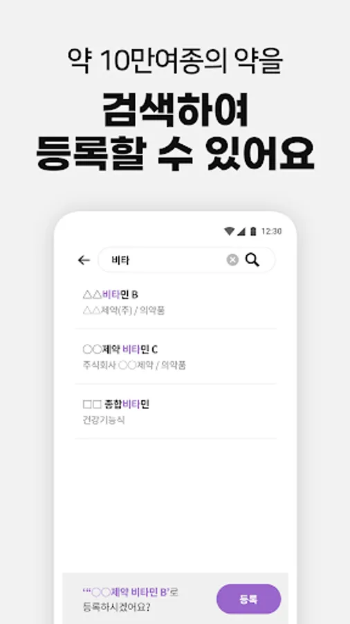 In the Yakkuk app, you can easily register a medication schedule by searching for medicines and health functional foods in over 100,000 provided by the Ministry of Food and Drug Safety.