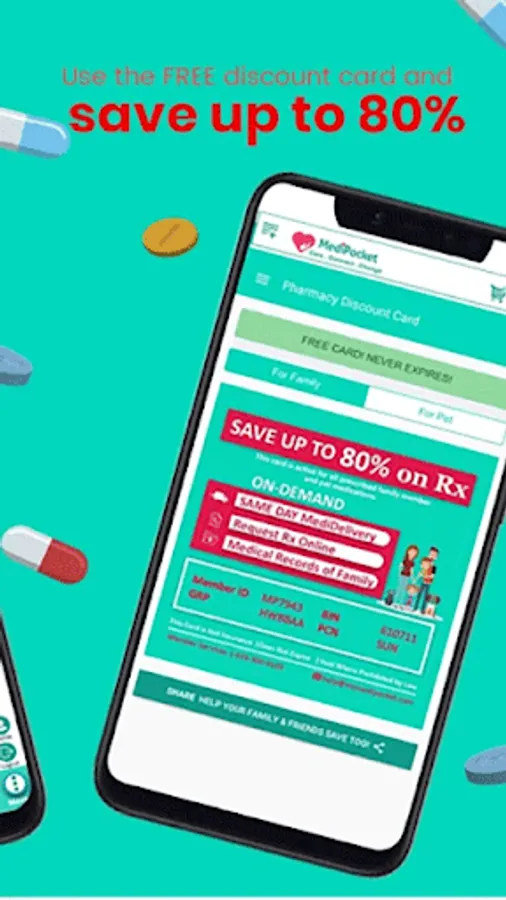 Using the discount card is simple! It is stored in the app under your profile - simply hand your phone to the pharmacist to save up to 80% and ask them to save the card to your profile in their pharmacy system. With our app, there is no need to save or print the discount card again and again- you can find savings on the go! And with just a click, you can share with your family and friends to help them save too!