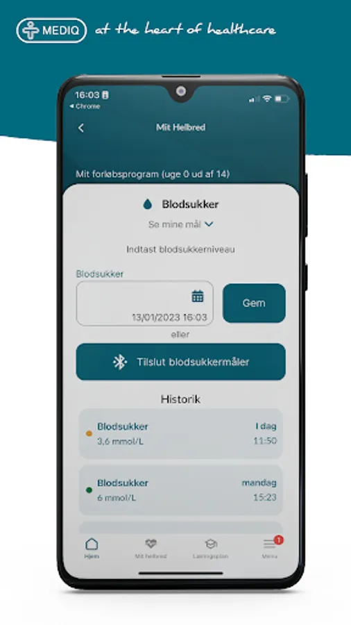 The Mediq Connect app supports people in the Digitalt forløbsprogram for Diabetes. The goal of the program is to help people understand their health and be able to self-manage. The Mediq Connect app allows you to learn about Diabetes type 2 and to follow your personal care plan by registering blood glucose, weight, activity and your wellbeing.