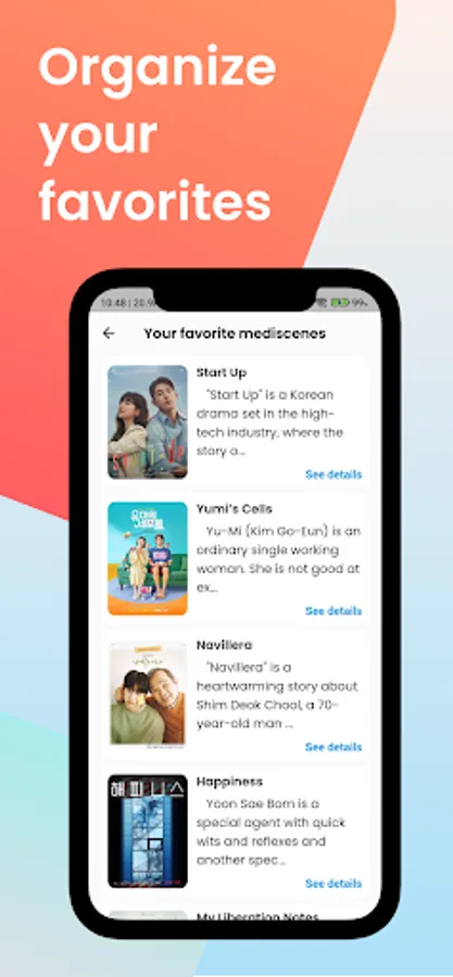 Discover an amazing world of Korean dramas with Mediscene, a mobile app that provides you with a comprehensive list of your favorite shows! With its user-friendly interface, you can easily navigate and explore the vast collection of Korean dramas available. What's more, you can create a personalized checklist of your favorite dramas and access them anytime. The app also offers detailed information about each drama, including stunning images and a detailed description of the plot. With Mediscene, you can make informed decisions about which Korean dramas to watch and where to find them. It's the perfect tool for K-drama enthusiasts who want to keep track of their favorite shows and discover new ones.