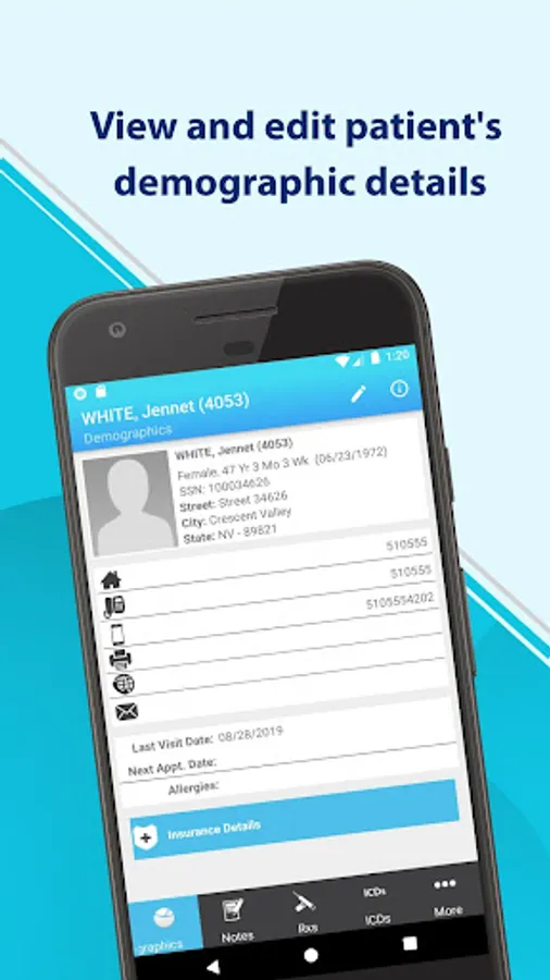 * Patient Demographics: View patient contact information, allergies, ICDs, prescriptions, visit notes, lab orders, vitals, notes, documents, and insurance details
