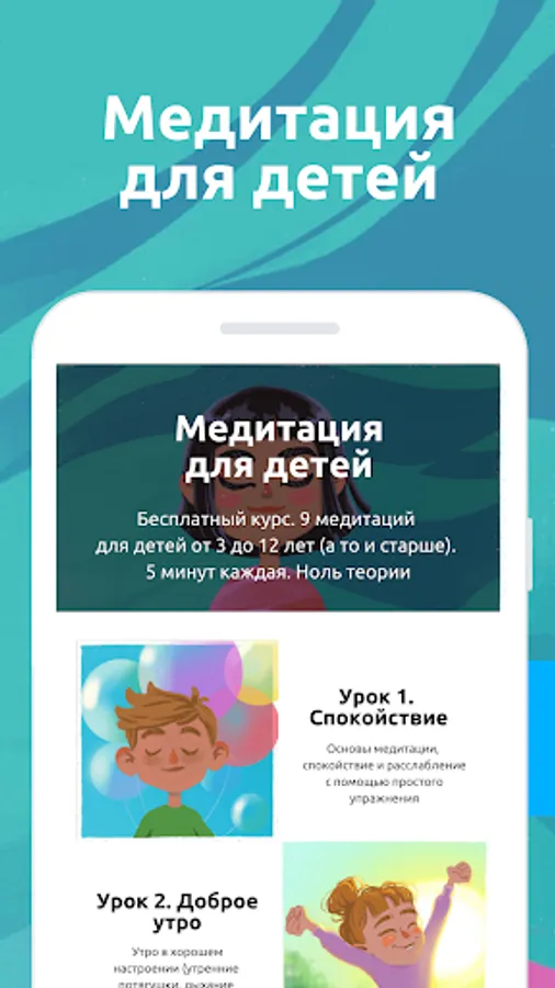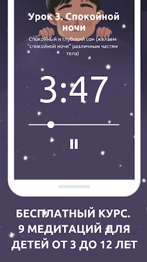This application was created so that every child could practice meditation as much as possible. Therefore, lessons cannot be bought in it. Each subsequent lesson can only be “earned” by completing any of the previous ones. As soon as the child has completed the lesson, he receives a medal for the lesson, and the next lesson opens (until all lessons are open, after which you can study any of the lessons without a set of medals).