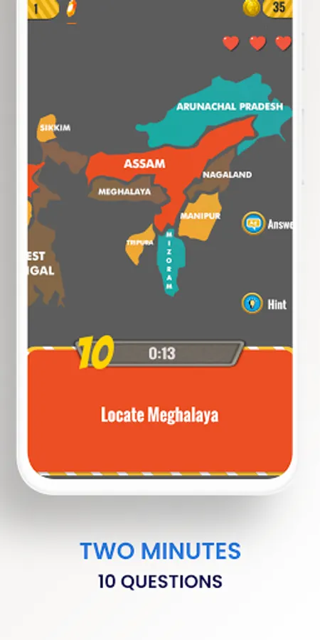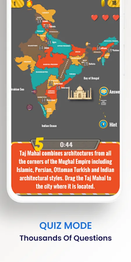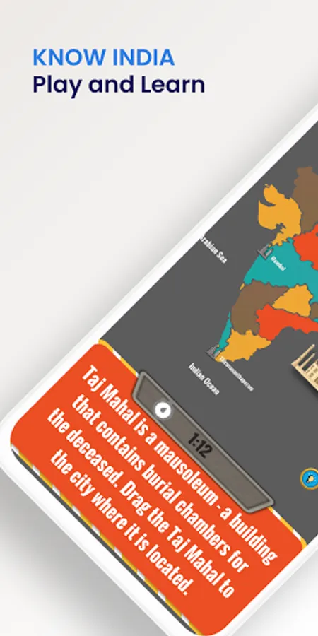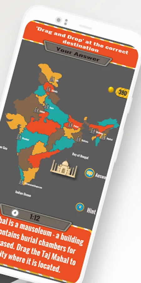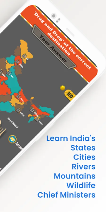 The game asks question about Indian states, cities, capitals, mountains, rivers and monuments and asks the player to touch and select the answer from a map. Drag and drop questions ask you to drag a image of a monument, animal etc to the right destination like a national park, river, city or state. This helps to improve your memory and recollection as you are using both visual as well as positional information to store the information in your mind. No other India Geography game has such features. Now also use it for India GK Quiz Hindi competition practice.