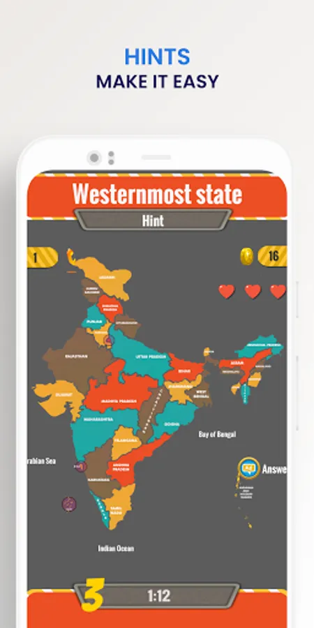A game which helps people of all ages learn about Indian states, rivers, cities, mountains, wildlife and monuments. Play and learn trivia at the same time. This India Map Game is helpful in preparing for India quiz competitions and increasing your knowledge (GK, IQ) and trivia about India. Latest update allows you to play India Quiz Hindi.