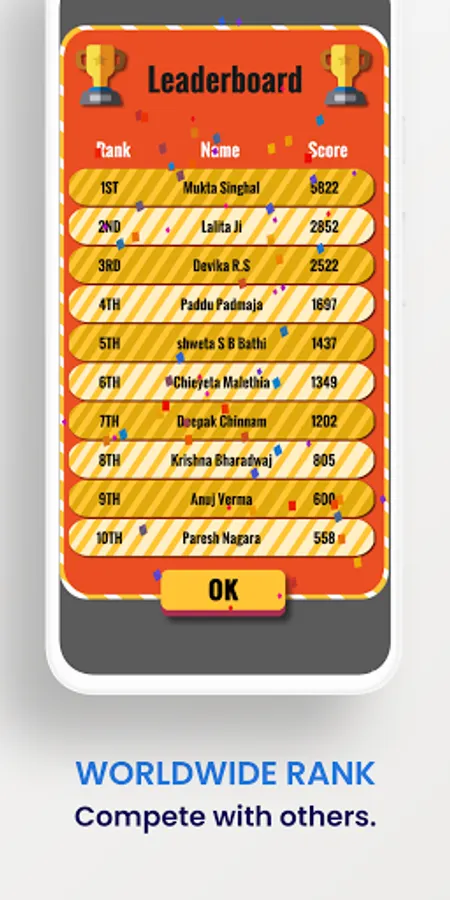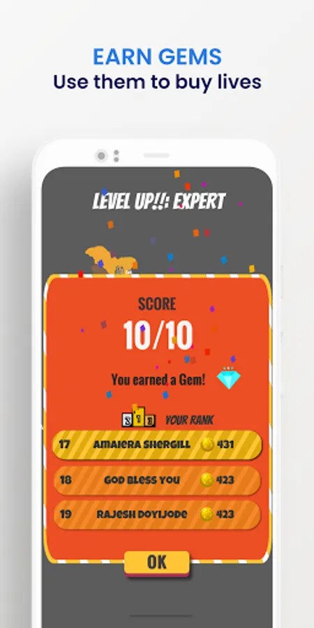 Earn virtual gold coins for each correct answer and every time you get all questions correct in a round you earn a gem or a diamond. You get double or triple coins for each correct answer if you are at a higher difficulty level. The top 10 users who have the most gold coins get featured on the worldwide leaderboard.