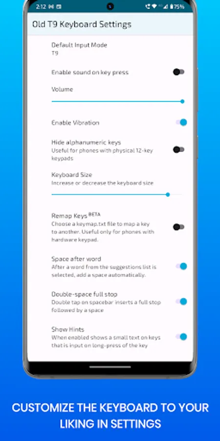The Old T9 Keyboard also has features like keyboard height resizing, vibration and sounds on key press.