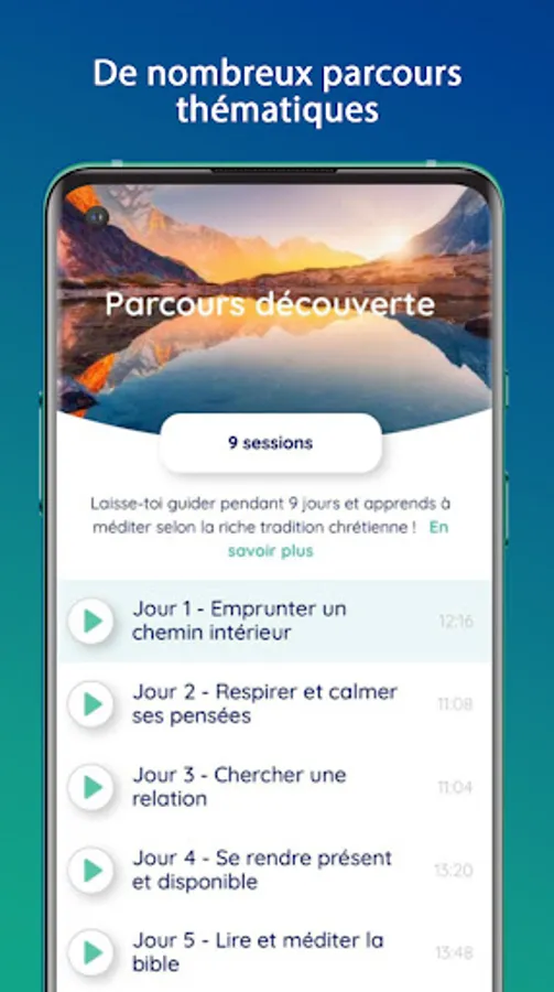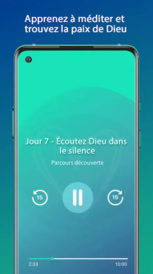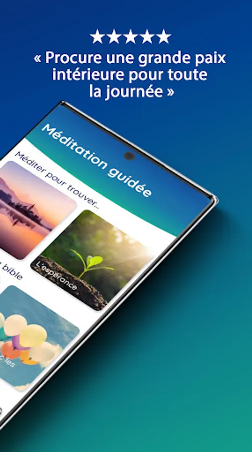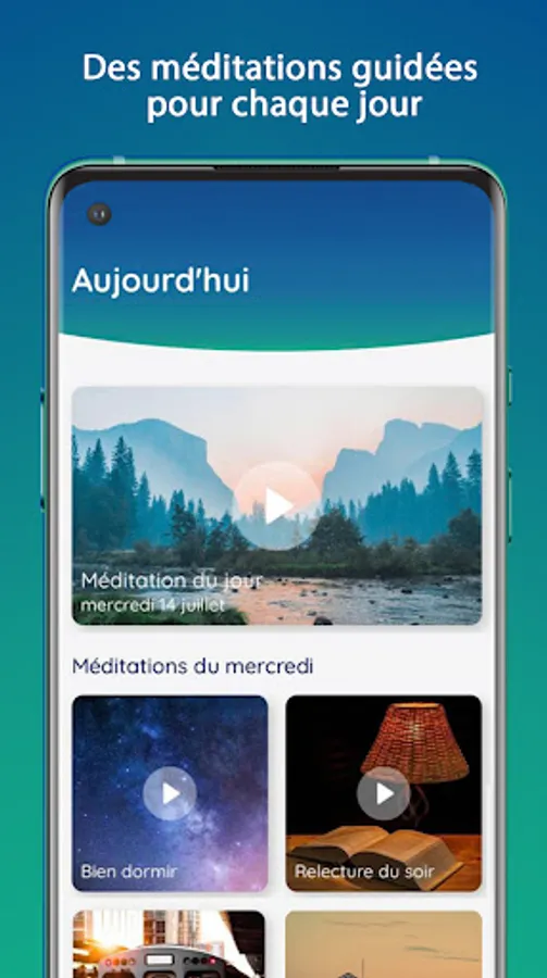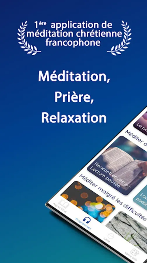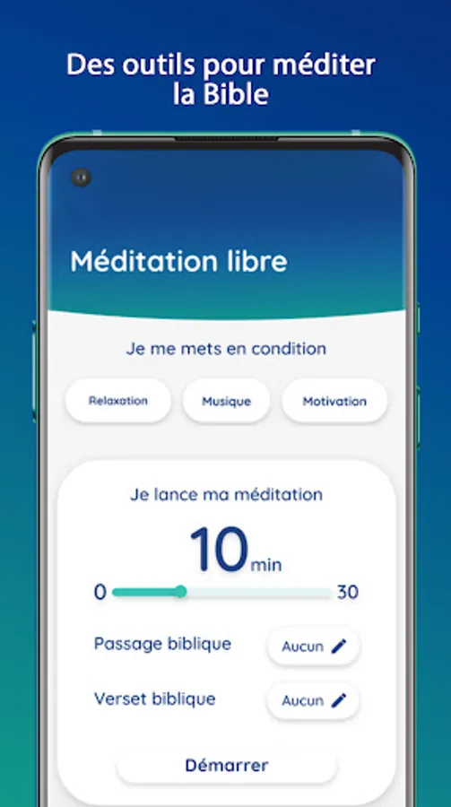 Then, you will find many guided meditations around themes (joy, peace, fullness, stress and anxiety management, ...) and passages from the Bible. You will also find a free meditation screen with various tools allowing you to relax (in particular with relaxation exercises from the Vittoz method, breathing exercises, ...) then to take a time of silence with God, accompanied by 'a passage or a Bible verse if you wish.