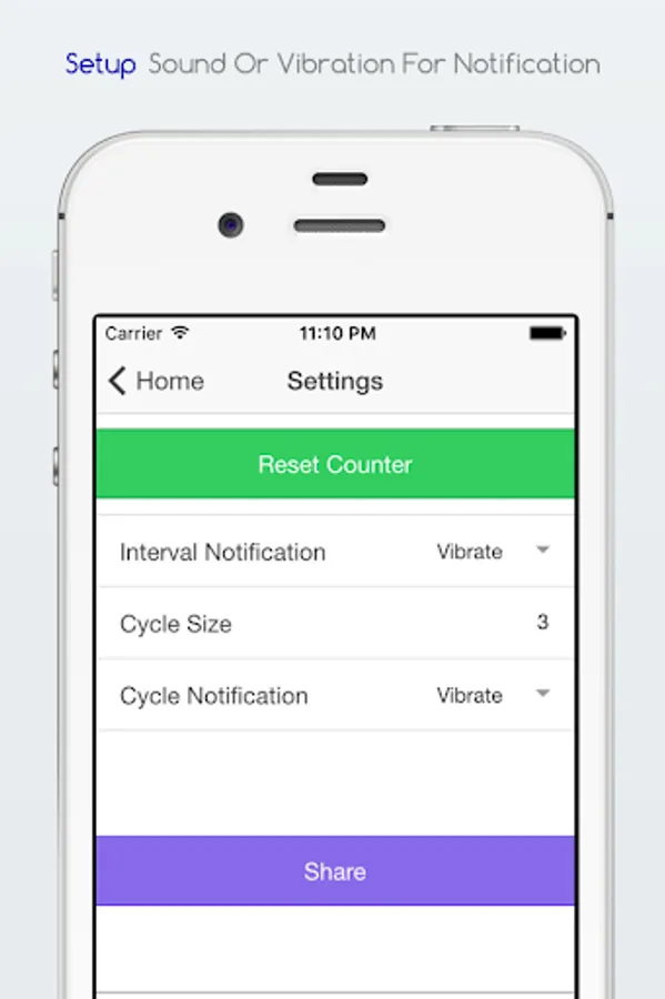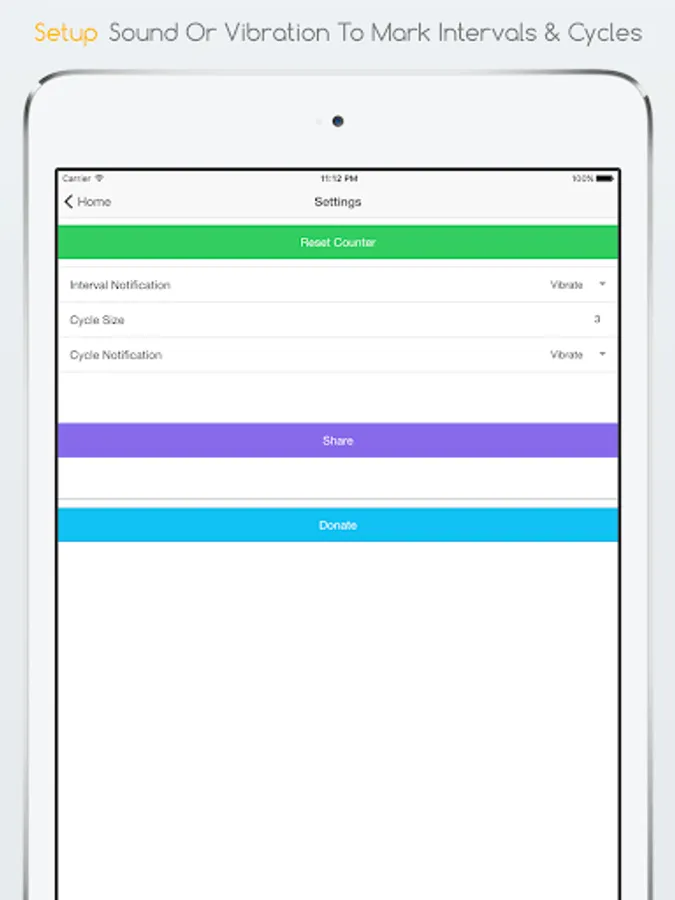 App settings allow you to choose between tactile vibration or audible sound. You can set a custom value for how many intervals equals 1 cycle. You may also customize how the interval and cycle notifications manifest (as vibrations or audible chimes).