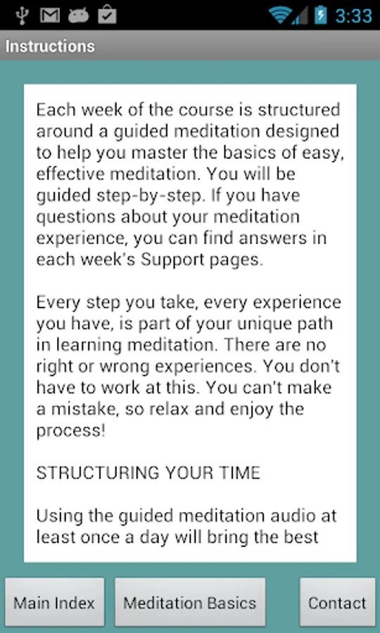 The Meditation Oasis® Learn to Meditate app is designed to make learning meditation easy and enjoyable. You will be able to meditate along with the guided meditations from day one, and you will have all the support your need to address any questions or challenges you may have along the way. By the end of the five weeks, you will have everything you need to continue meditating on your own.