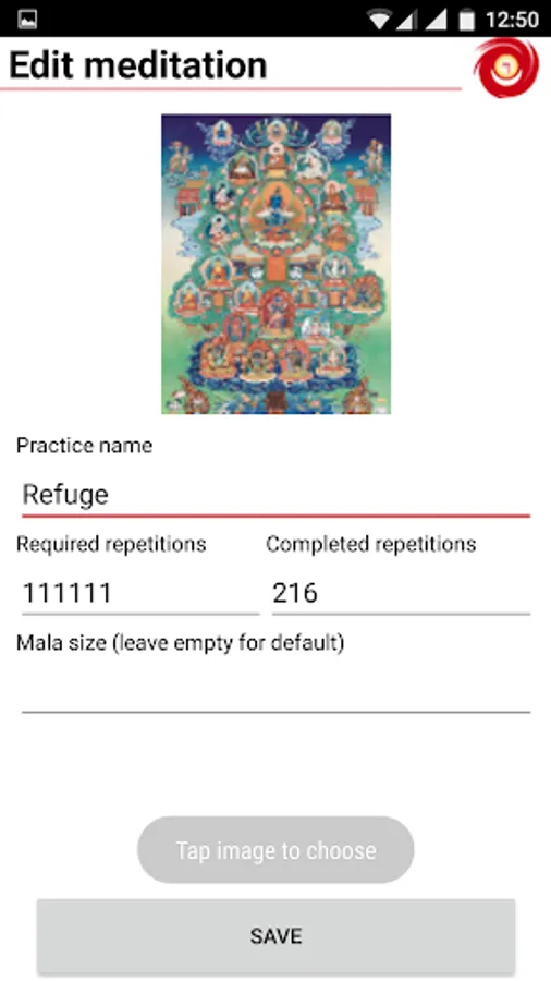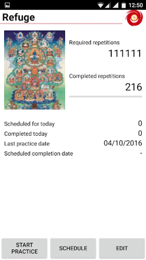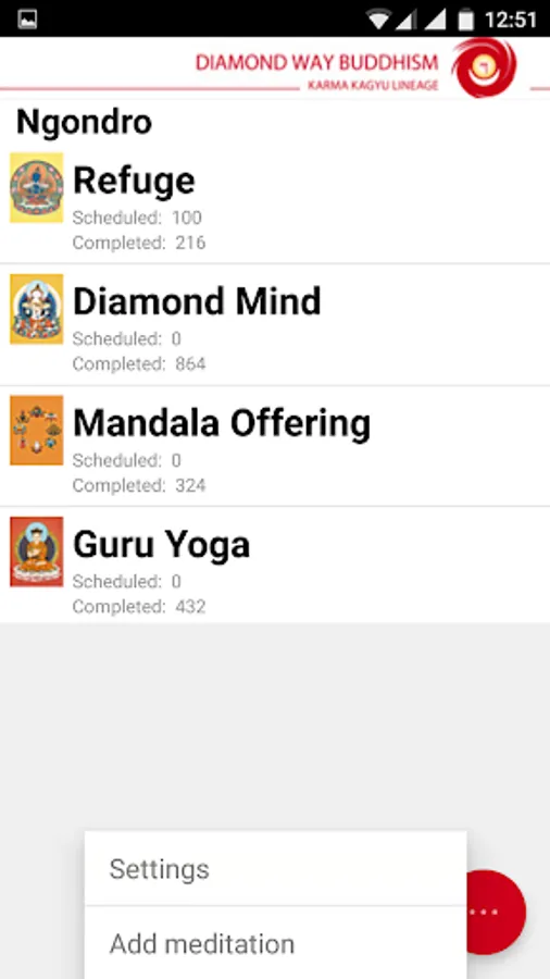 Meditation tracker comes with predefined preliminary practices group(Ngondro) and you can of course add your own practices and plan a schedule based on date you aim to complete practice or number of daily repetitions. Each session is stored for possible later use.