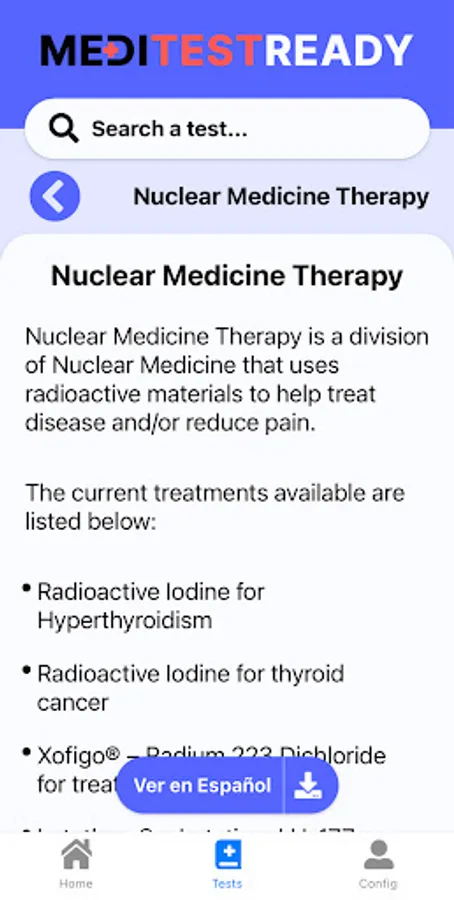MediTestReady is a guide to Nuclear Medicine, PET and Nuclear Therapy studies and treatments in English and Spanish. Perfect for the non-Spanish-speaking technologist or scheduler.