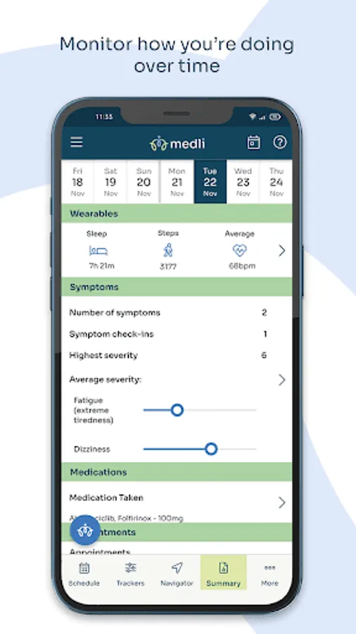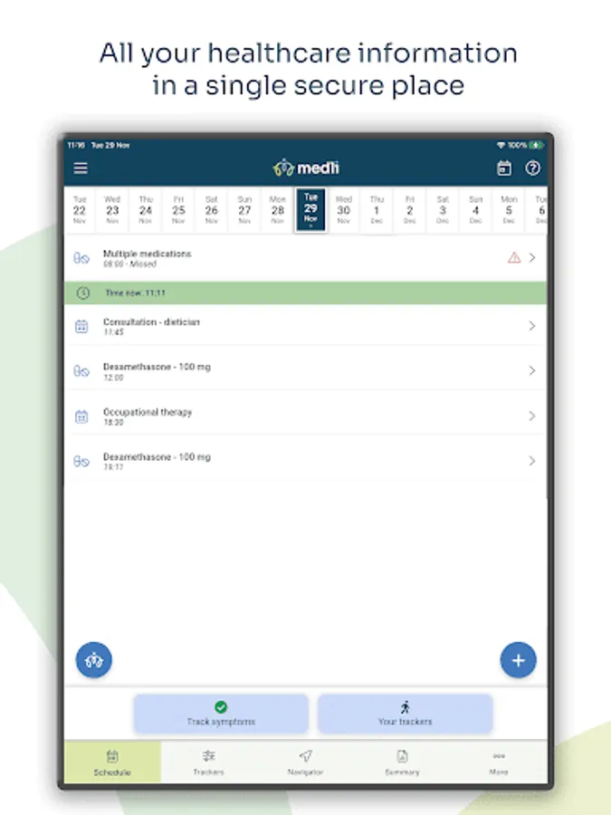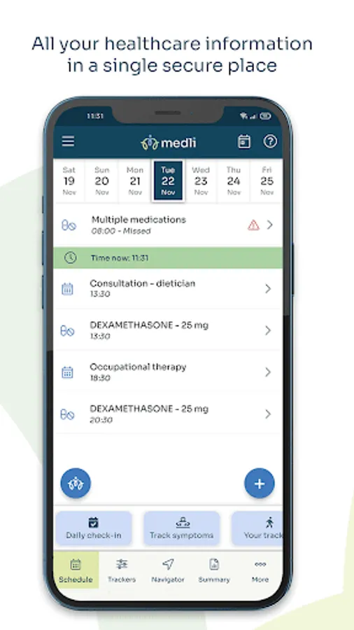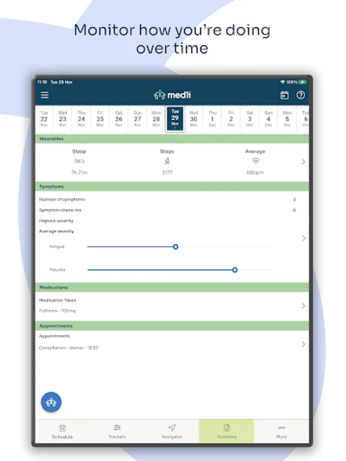 Medli offers you a simple, intuitive App to help you stay in control. Record your treatments, appointments, medications, symptoms and side effects in one safe, secure place. Manage each of your conditions in a single App. Connect to Google Fit, create your own trackers, decide what you want to measure, so that you can live your best life.