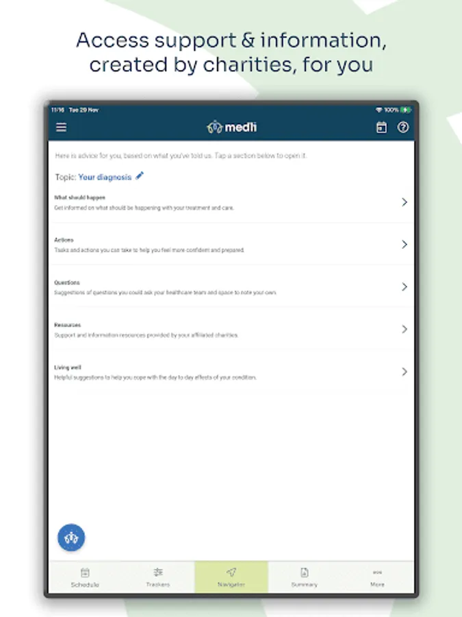 Use the Medli Symptom Tracker and Insights to spot trends and build understanding. Search for Clinical Trials and Benefits you are eligible for. Use our discussion boards to connect to people who have relevant experience who may be able to help you. Keep all your notes, PDFs and Images to hand in one place. Decide how much or how little information you want to share with your friends, family, health care team and research.